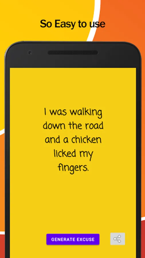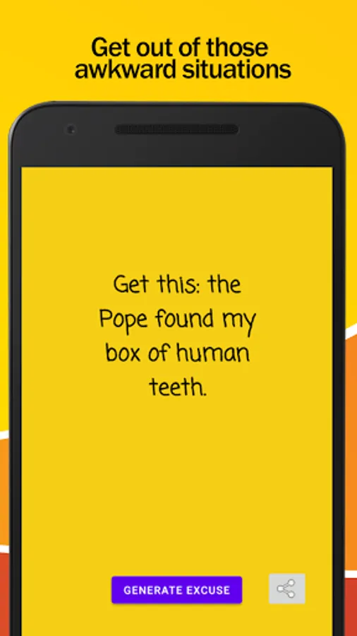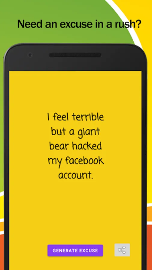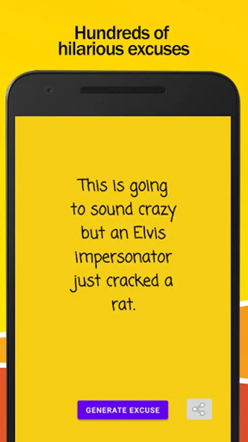 Tap into the unexpected with our Random Excuse Roulette! Swipe through a variety of hilarious excuses and find the one that perfectly matches your situation. It's like having a comedy club in your pocket, ready to bail you out!