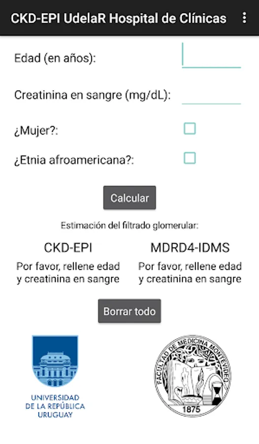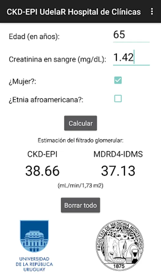 The application performs an estimation of glomerular filtration according CDK-EPI and MDRD4-IDMS equation, from the patient data: age, creatinine, gender and ethnicity.