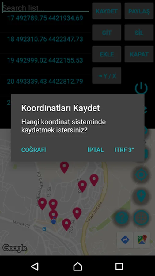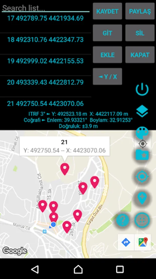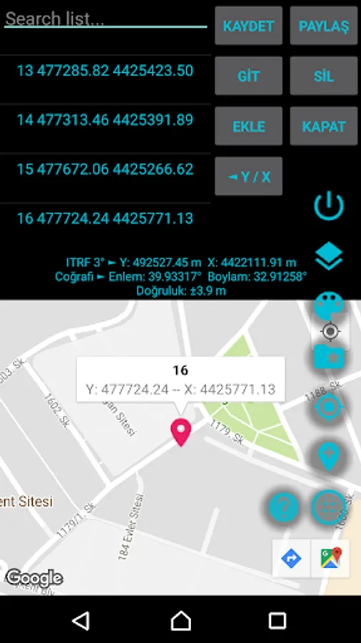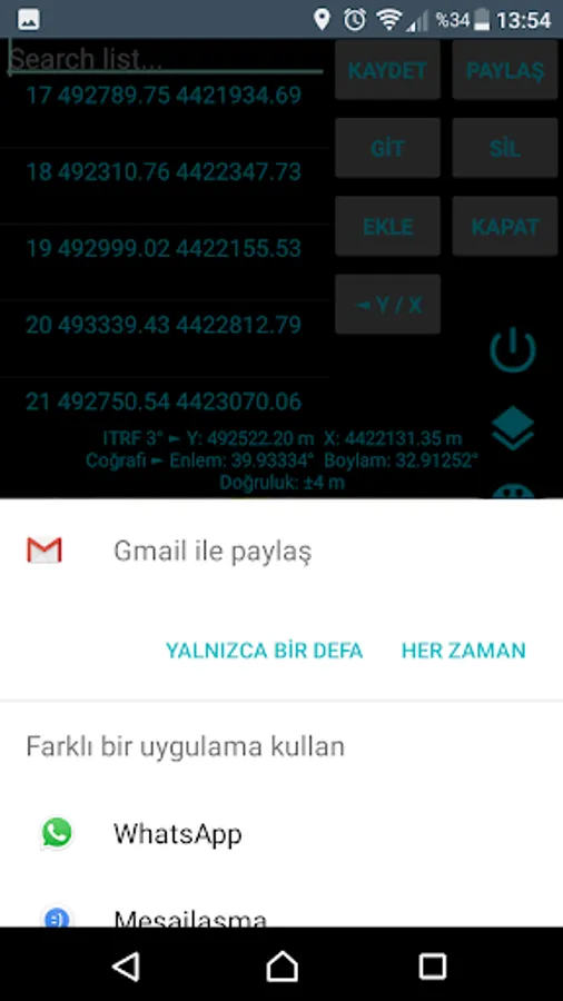 + Coordinate list easily txt as whatsapp, mail, bluetooth etc. share through platforms