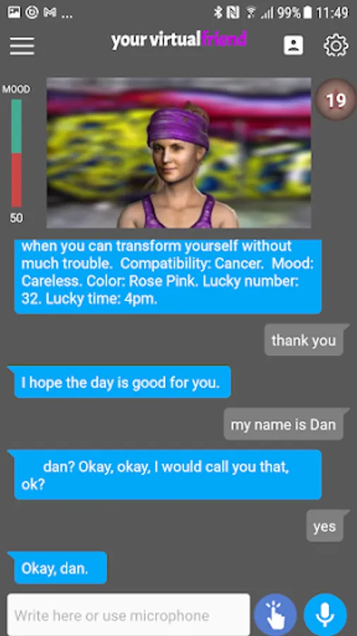 You can chat with her face to face .... she will answer you like a human ... most of the time! Your virtual friend can keep you company. She can even become your friend!