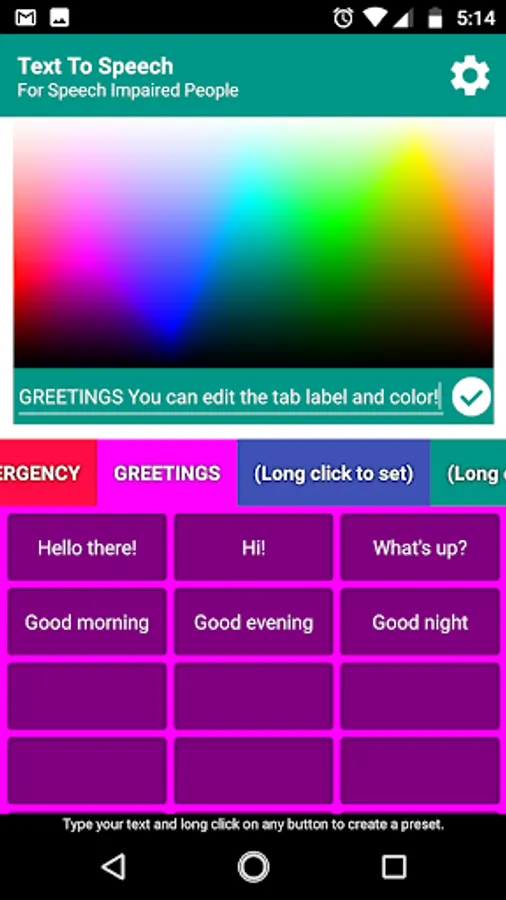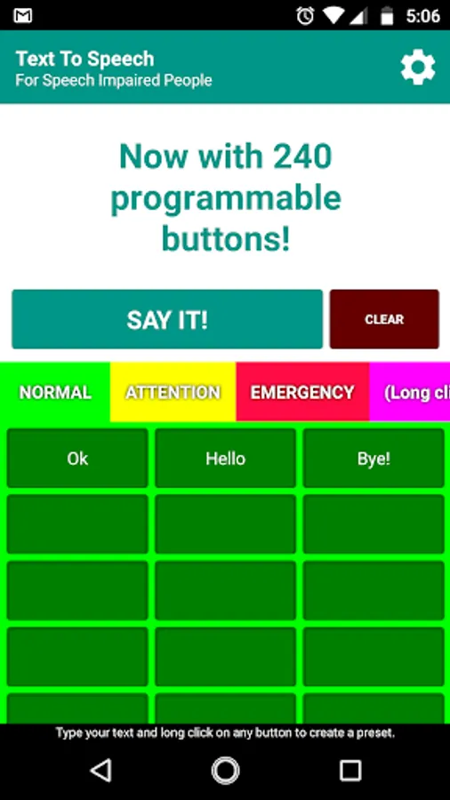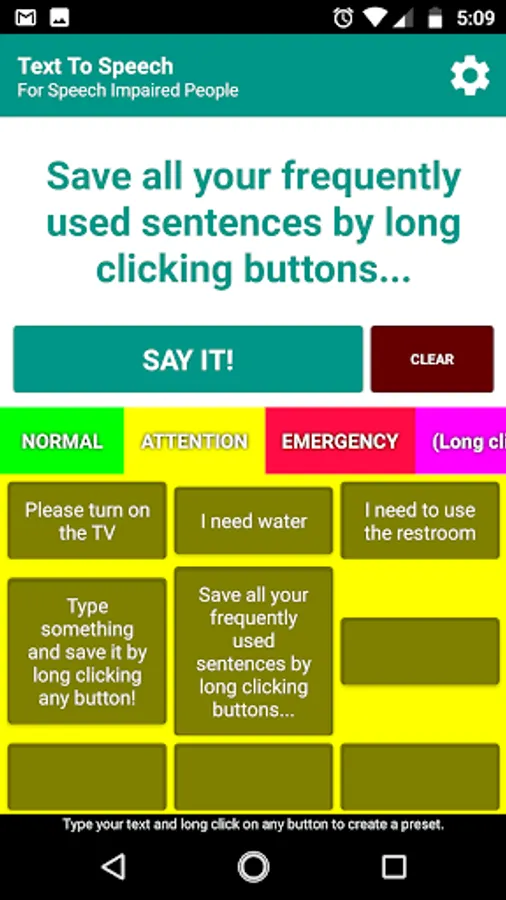 This app allows people who is unable to speak to quickly communicate spoken messages using their mobile device. Just type the message or choose one from the pre set keyboard and the speech engine will clearly say the text typed.