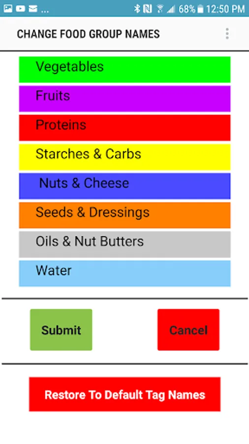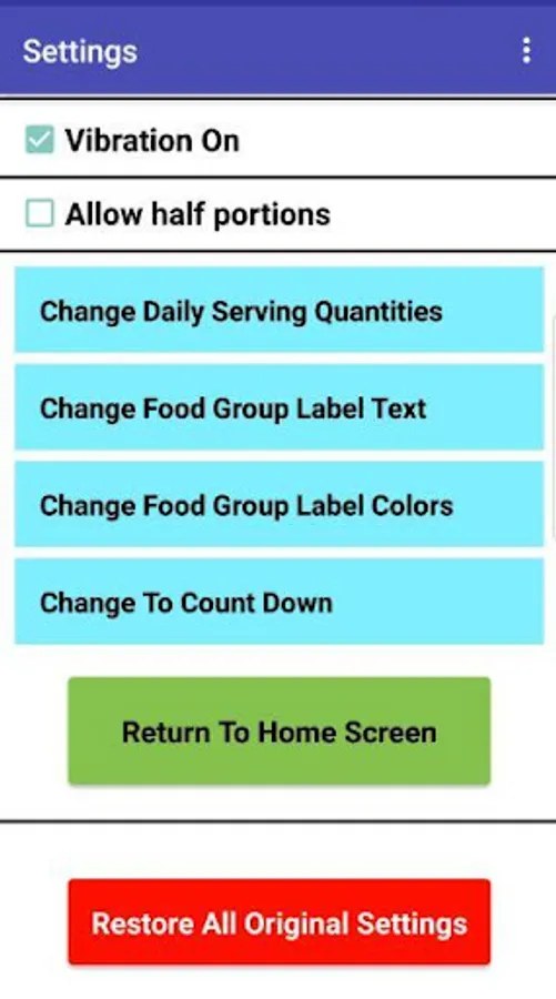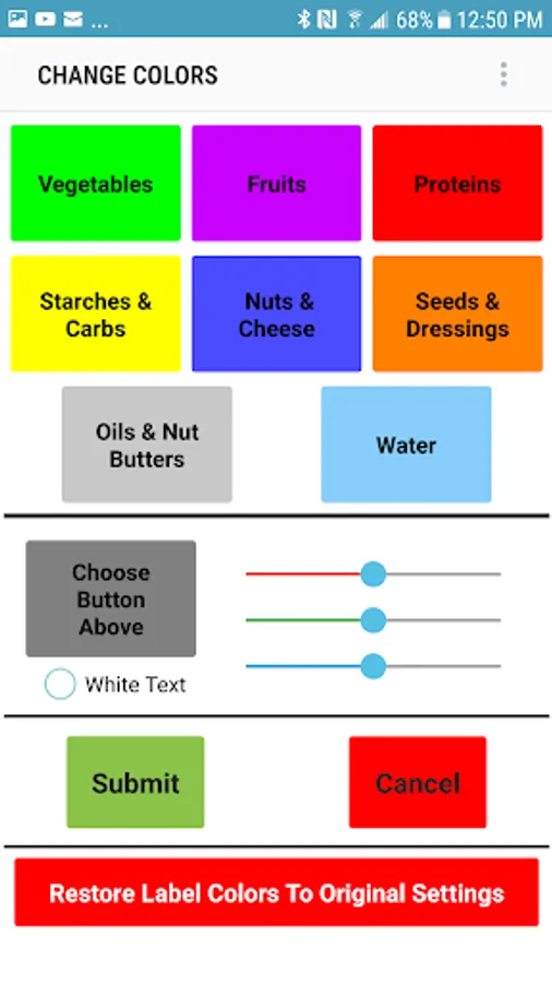 At any time you can easily change the text of each of the 8 buttons (which are your food groups), change the color of each button, and even switch the text color between black and white, depending on your preferences.