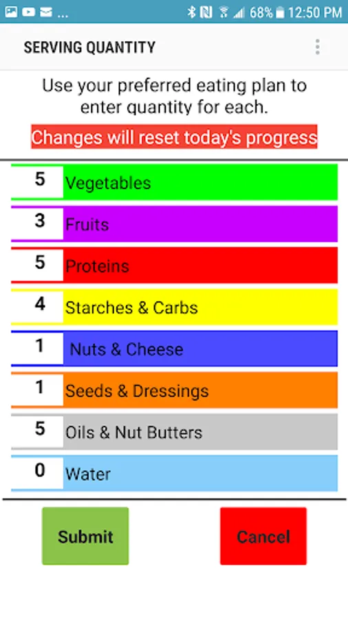 Included is two preset plans (1500-1800 calories OR 1800-2100 calories), which you can choose or not choose to use. You also have the ability, in the settings, to enter any quantity for each food group.