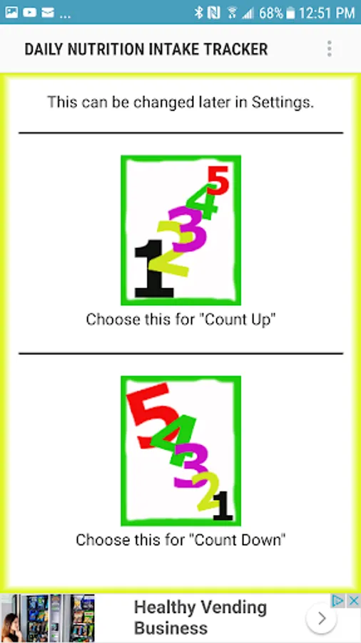 When the app starts up for the first time, you are given the opportunity to choose to count up (from zero) or count down (to zero) your daily portions for each food group. This can easily be switched later, in the settings.