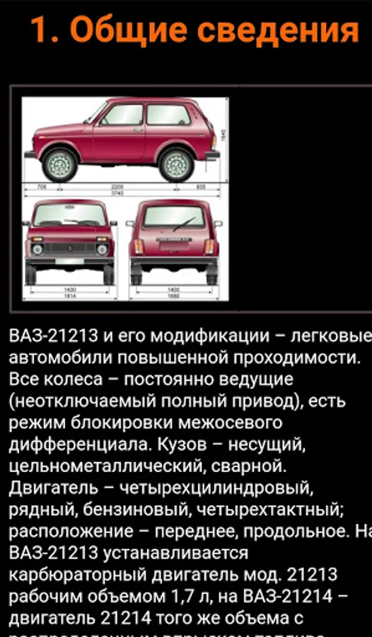VAZ-21213 and its modifications - off-road passenger cars. All wheels are constantly driving (non-disconnectable four-wheel drive), there is a center differential lock mode. Body - load-bearing, all-metal, welded. Engine - four-cylinder, in-line, gasoline, four-stroke; location - front, longitudinal. The VAZ-21213 is equipped with a carburetor engine mod. 21213 with a working volume of 1.7 liters, on the VAZ-21214 - an engine 21214 of the same volume with distributed fuel injection. (Previously, the 21214 engine with central fuel injection and a microprocessor ignition system was installed on VAZ-21214 cars). VAZ-21215 (exported) is equipped with a 1.9-liter XUD-9SD diesel engine of the Peugeot-Citroen concern. A gasoline engine with central injection and a diesel engine are practically not found in Russia and are not described in this manual.