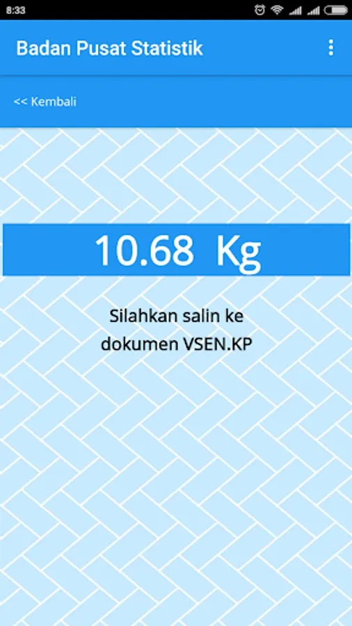 Example of one commodity, namely vegetable string bean with a small bunch of local units as well as a large tie converted to standard units Kg. Susenas enumeration officers can accelerate the time of enumeration and in terms handed to the inspectors without counting again by using arithmetic calculator.