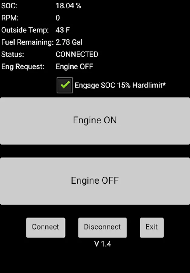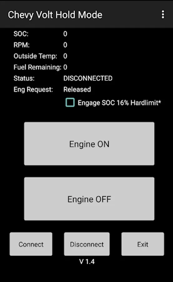 My Volt Hold adds a temporary Hold Mode on Chevrolet Volt 2011 - 2012 with a OBDLink MX bluetooth or compatible elm327 bluetooth module. Anti ERDTT works if you request engine to stay off works on all model years. Not every elm327 bluetooth module will work with this app. If you get any errors, a check engine light, or it does not work please do not continue using MyVolt tool or try using a different elm327 adapter. For the most compatibility please use Scantool.net OBDLink MX bluetooth adapter.