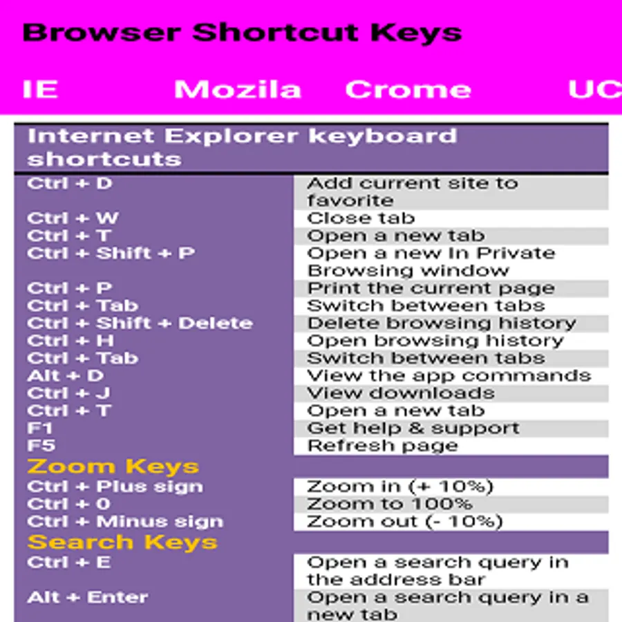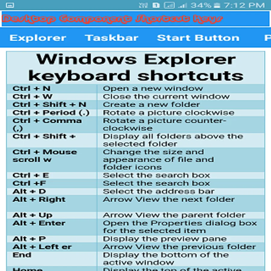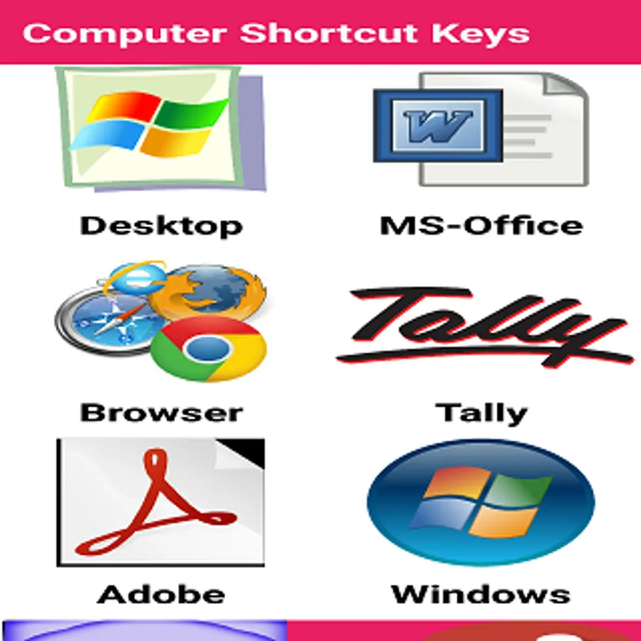 App contains all Computer Shortcut keys windows component taskbar ,explorer ,desktop and frequently used application software like ms-office ,Adobe ,Tally.