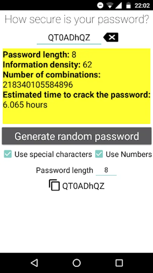 With this app you can check your password security and generate new ones. Never check your real passwords, because your password is displayed in plain text and because you should never reveal your real passwords. We do not guarantee for the calculated values because the app only covers brute-force attacks and not e.g. dictionary attacks. The app informs you if your password is very popular. Generated passwords do always contain lowercase and uppercase letters. All 26 letters of the latin alphabet are supported. All calculations are done offline and on your phone. The source code is licensed under CC-BY-NC license. Visit https://creativecommons.org/licenses/by-nc/4.0/ for more information. The sources can be found here: https://github.com/10MINT/password-checker-sources