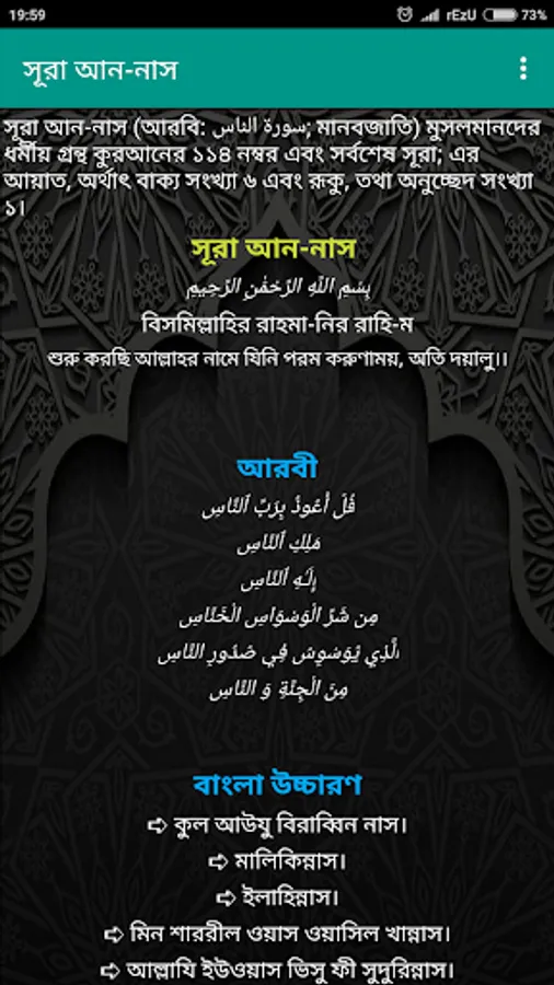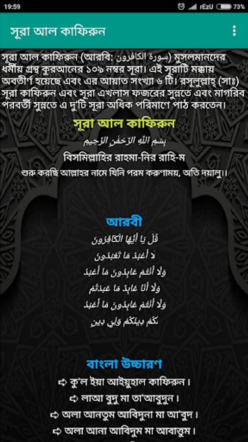 এখানে কুরআনের ১১ টি ছোট সূরা বাংলা উচ্চারণ ও অনুবাদসহ দেয়া হয়েছে । যাতে সহজে সূরা গুলো পড়া এবং মুখস্ত করা যায় । মুসলমানদের জন্য নামাজ ফরজ। নামাজ পরার জন্য সূরা জানা জরুরি । বাংলা অর্থ ও উচ্চারণসহ ১১ টি ছোট এই অ্যাপটিতে দেয়া হল ।