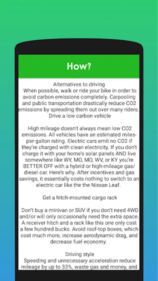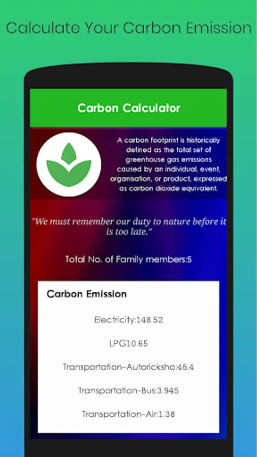 This app contains facilities for calculating our green steps and distance.The main aim of this app is to calculate the carbon emission of a Family or Individual daily or monthly.Graphical representations and audio mode is available