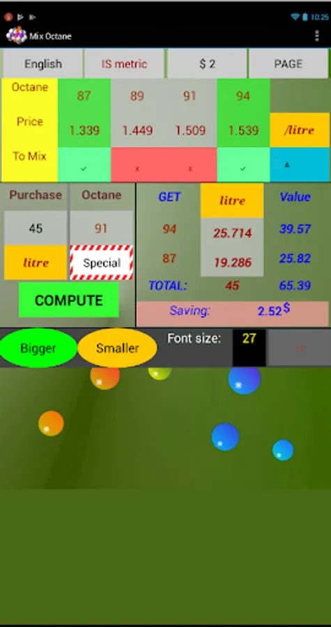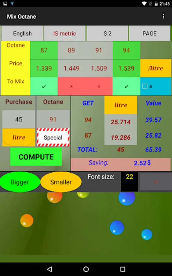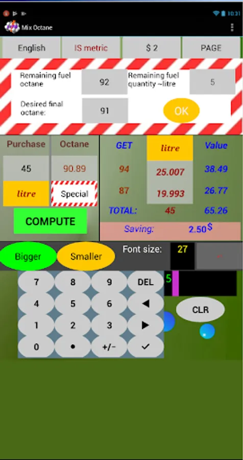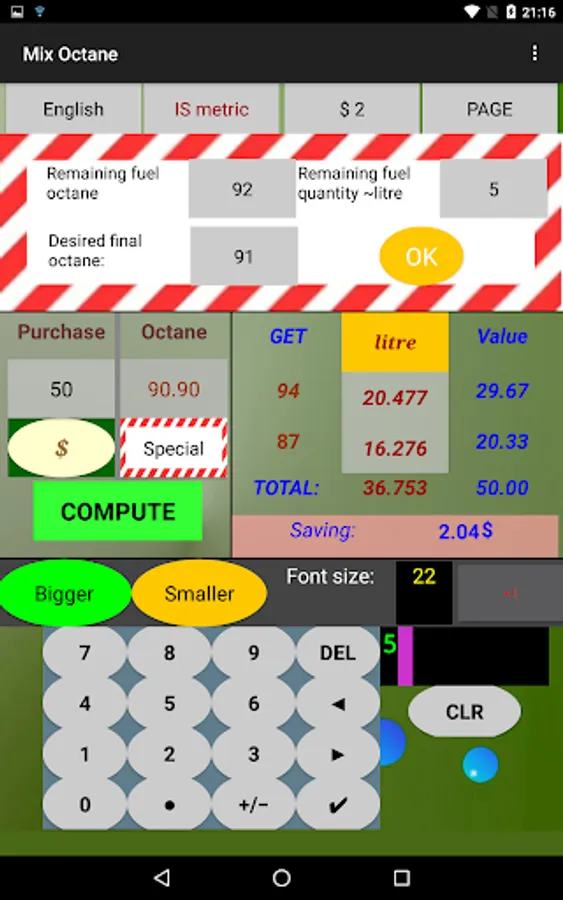 - ability to account for left-over fuel of a different octane (from previous purchase) in the overall calculation; the recipe for any octane rating between highest and lowest grade available can be defined