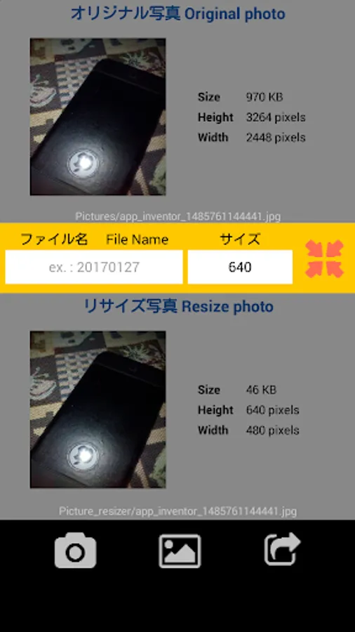 ・リサイズ画面の画像をタップすると画像が大きく表示