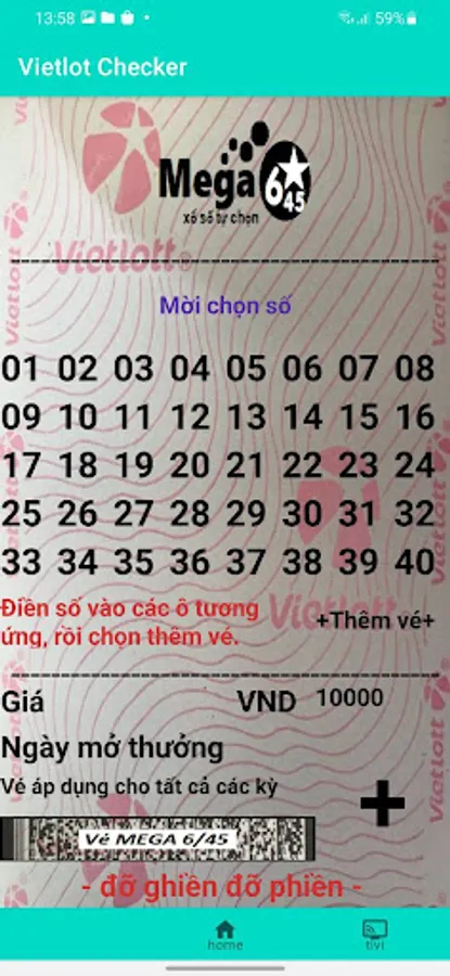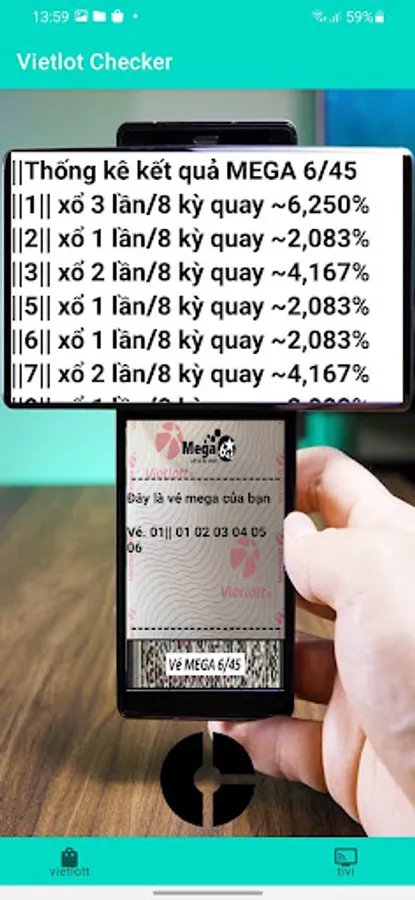 Application to detect vietlott tickets directly or indirectly. There is a function of statistics of good numbers in 3 main games: Keno, mega & power (will update other games as soon as possible).