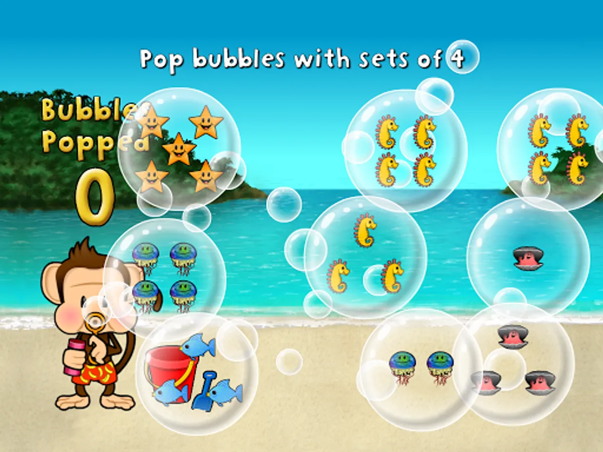 Monkey is running out of time! Pop all the bubbles that have either the right number or the right amount of objects inside before the time runs out!