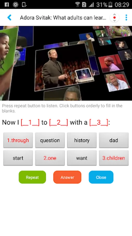 - Listening: Learner can practice listening by each sentence in the subtitle by filling words by blanks