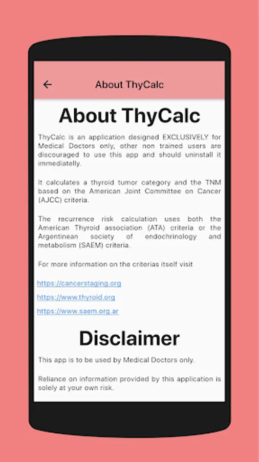 ThyCalc guides the Medical Doctor through the American Joint Committee on Cancer (AJCC) guide to calculate TNM and recurrence risk following the American Thyroid association (ATA) guide or the Argentinean society of endocrinology and metabolism (SAEM) guide.