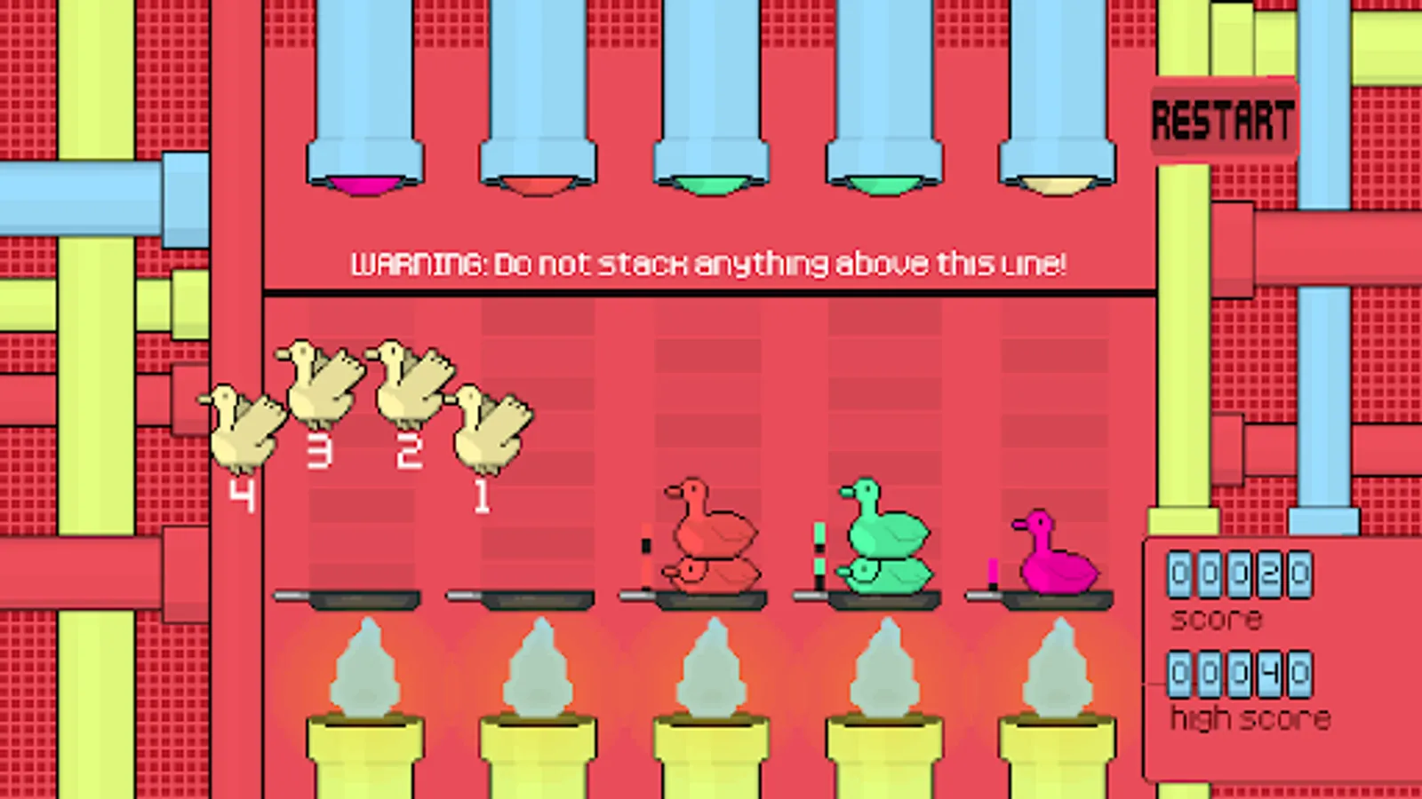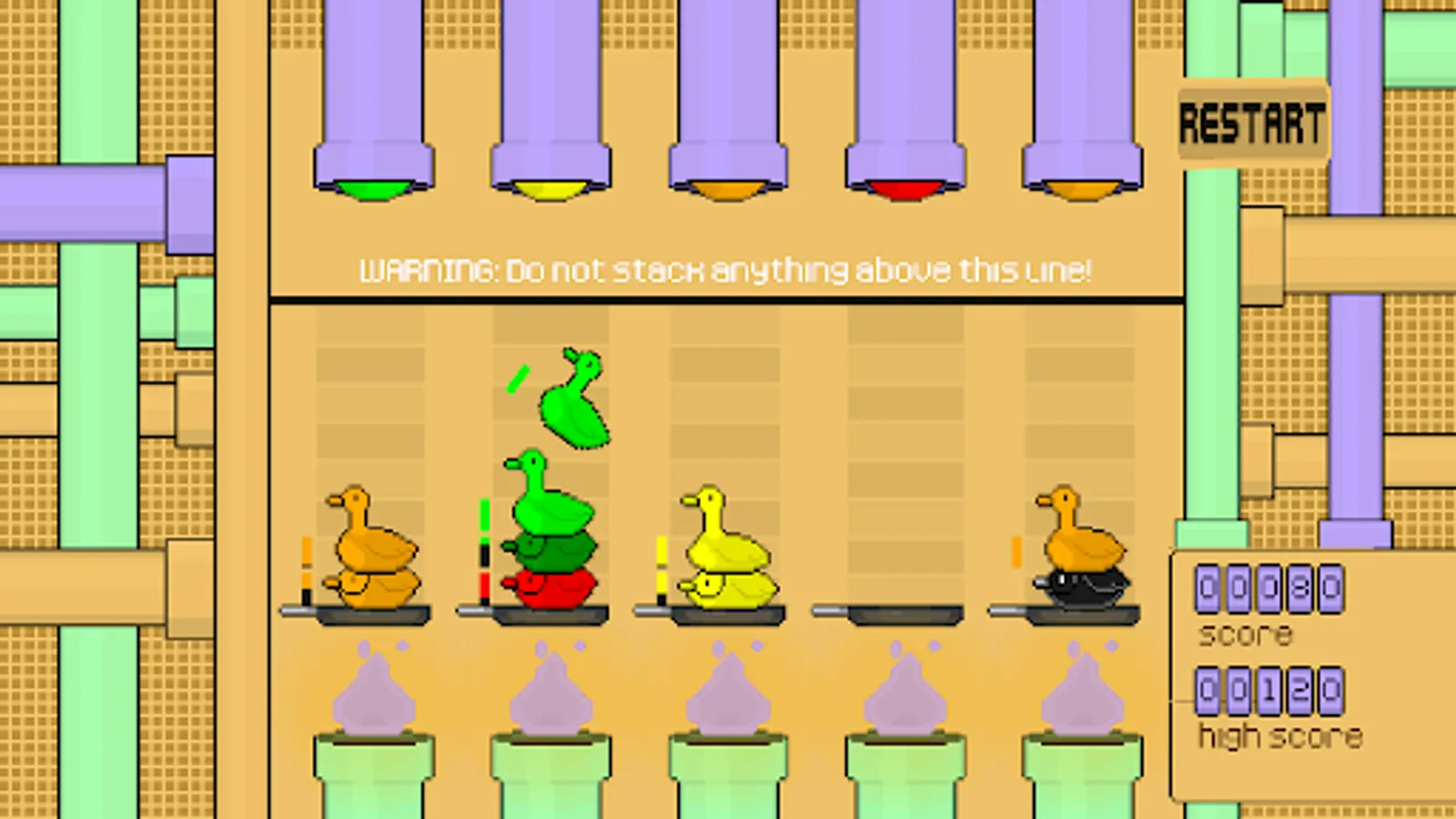 Wrack your brain in this puzzle game. Stack matching ducks before they burn to score points. Beware, if you stack too high, the stack will topple and everything will be ruined! See how high you can get your score.