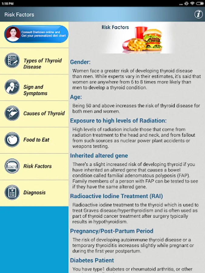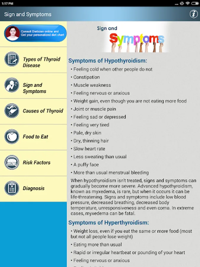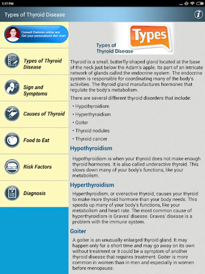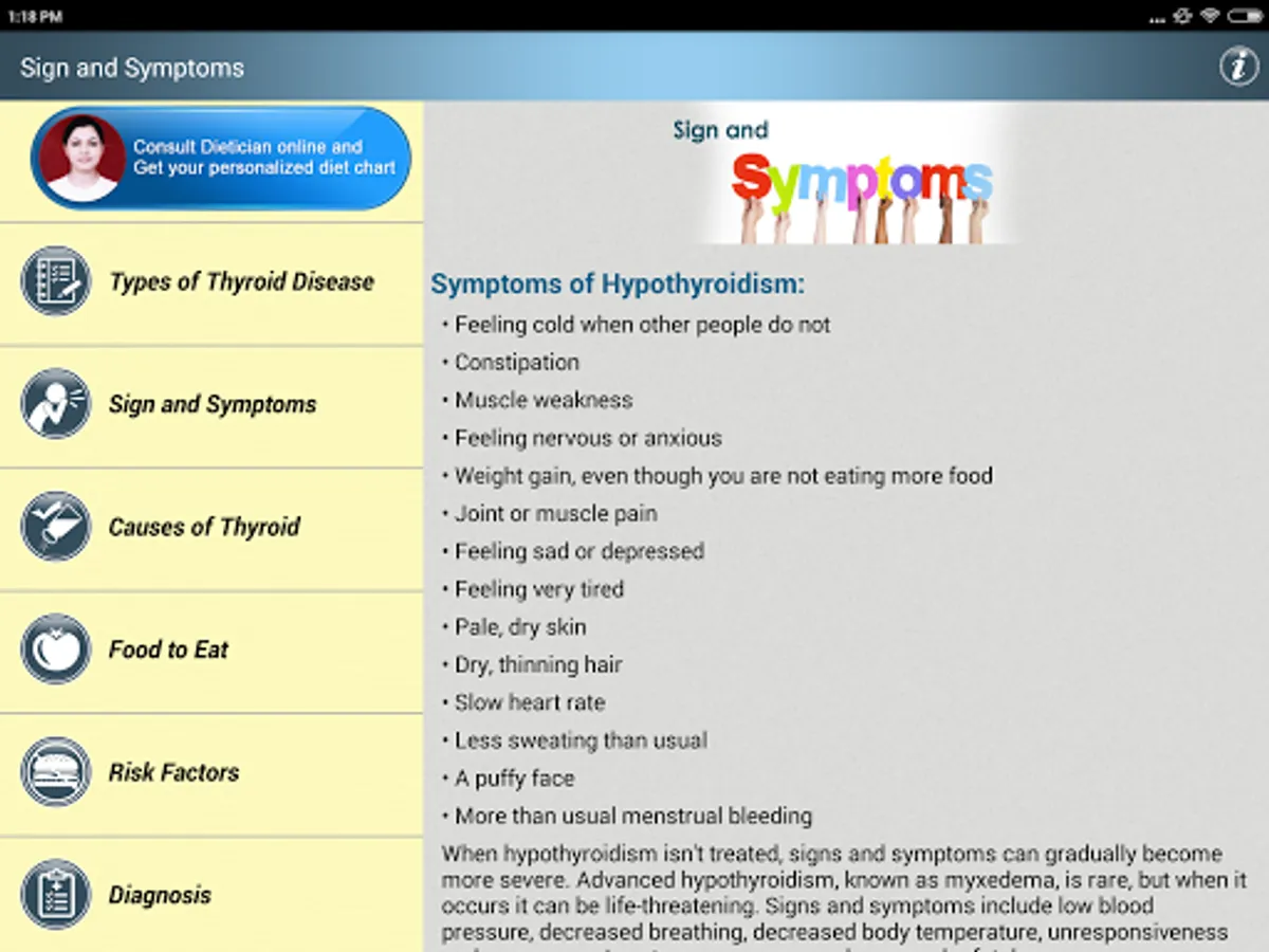 Thyroid Natural Treatment Help & Foods Diet Tips for High TFT Hyperthyroidism & Low TFT Hypothyroidism App has following Primary sections: