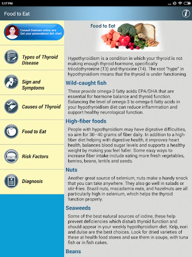 Thyroid Help & Foods Diet Tips is a Free App specially designed for Hypothyroidism & Hyperthyroidism Natural Treatment Diet and nutrition Tips and awareness in healthy people as well as in Thyroid Patients.