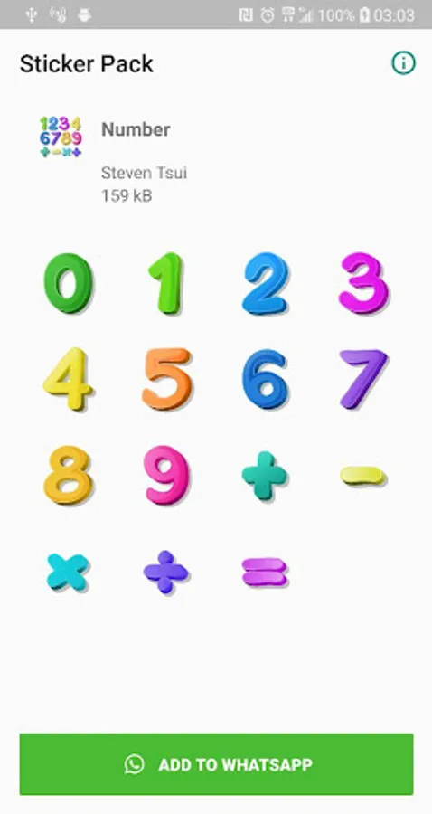 You can add the number (0-9) and ADD"+", MINUS"-", MULTIPLE"X", OVER"" and EQUEL"=" to your new sticker pack if whatsapp.