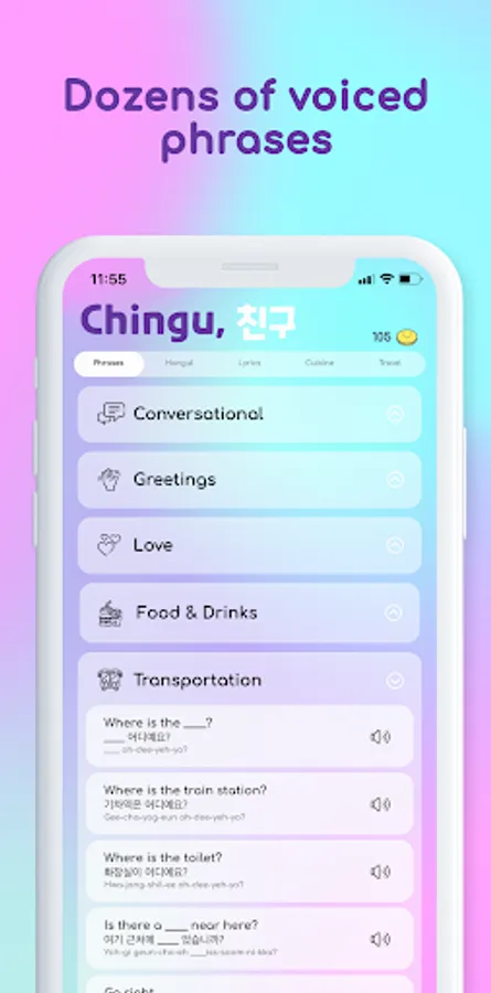 Learn from dozens of commonly used Korean phrases. Phrases are easier to remember, because they have meaning, they paint a picture, they tell a story. We ensured that our phrases are perfectly pronounced and voiced by a native Korean speaker.