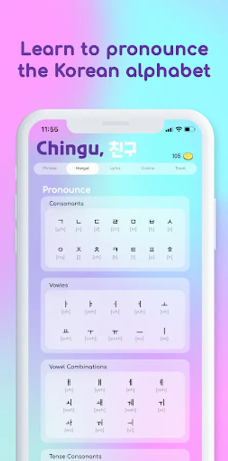 Learn how to pronounce and memorize Hangul, the Korean alphabet. The Korean alphabet is quite possibly the most elegant and logical language ever. With Chingu you`ll be able to read and write Korean in 15 minutes.