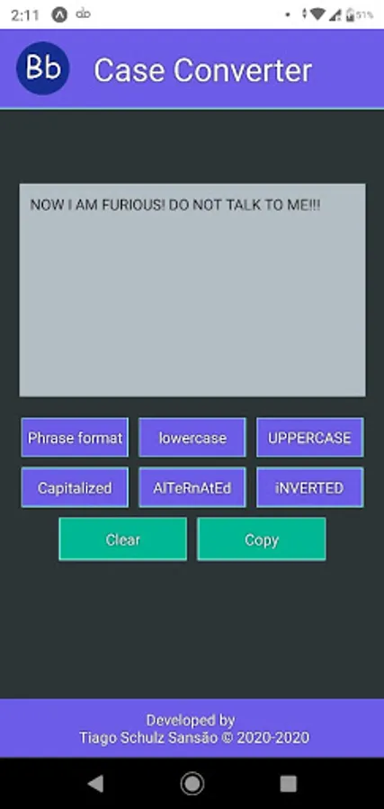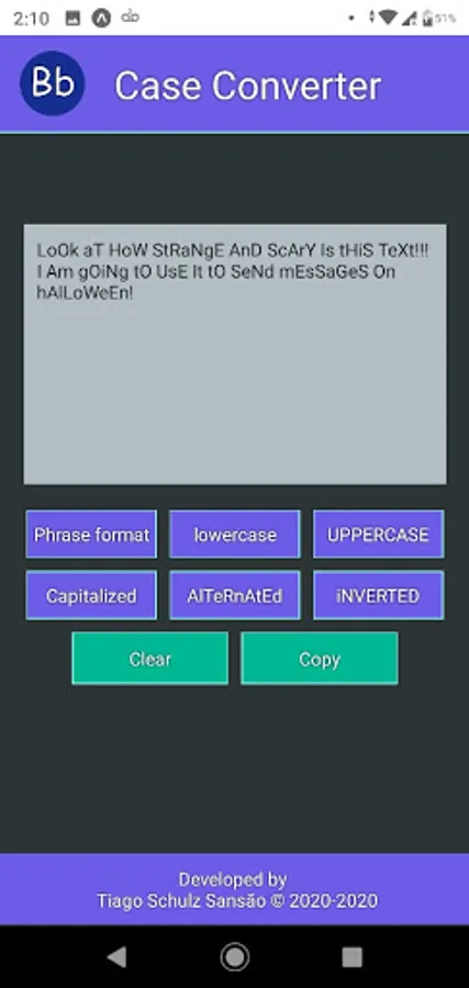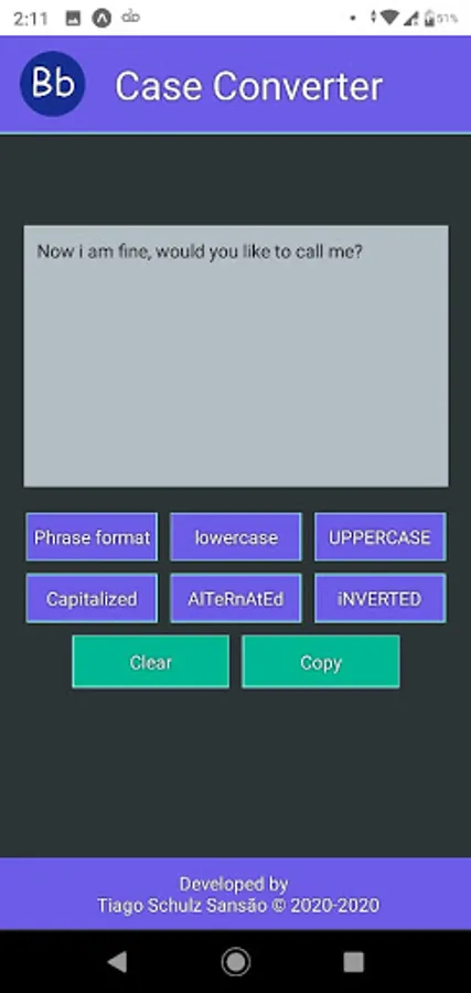 With this app, you can easily convert any text you want just clicking in one button. So, don't worry if you accidentally wrote something with only capital letters or are not sure if all letters after punctuation are capitalized, using this app you can convert it to anything you want, check our options below.