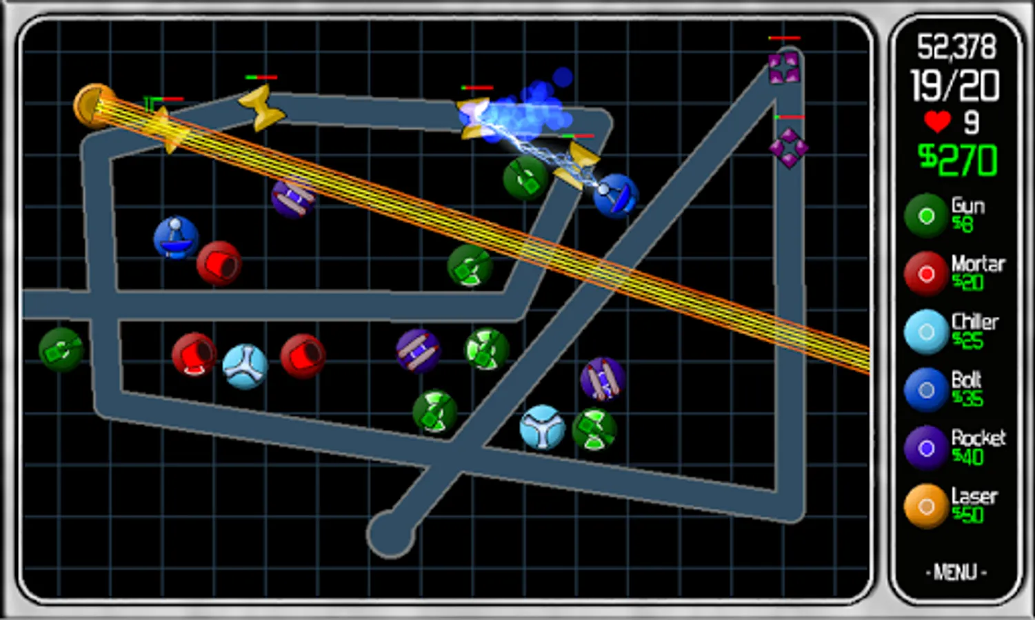 Laser - A laser beam goes forever and deals damage to anything in its path.