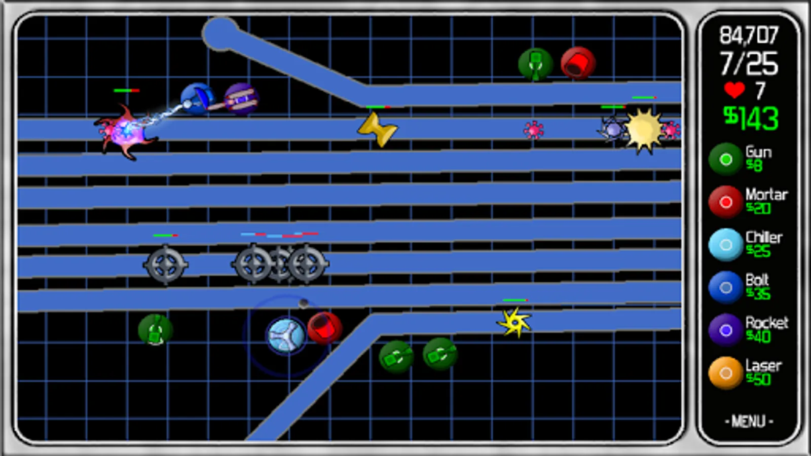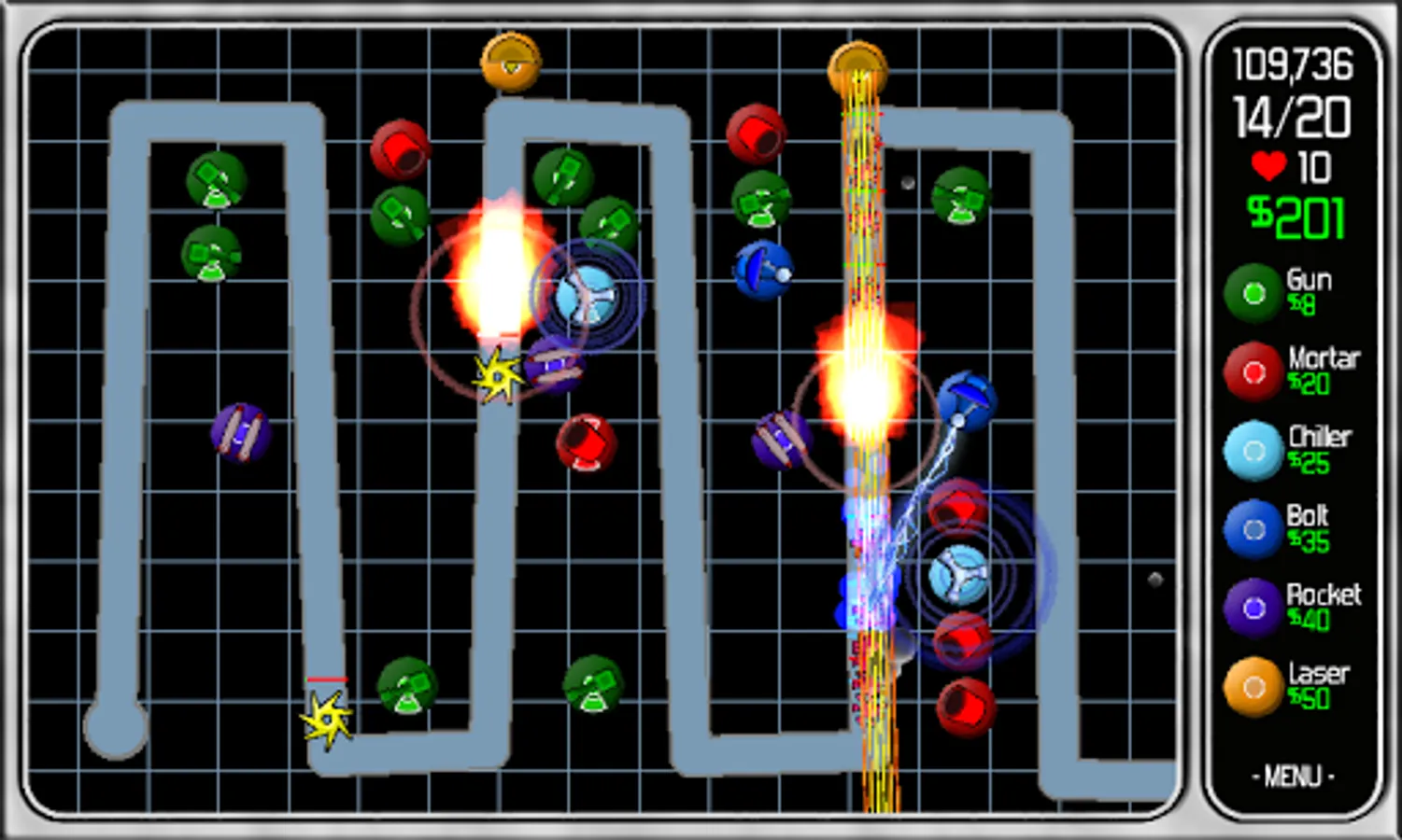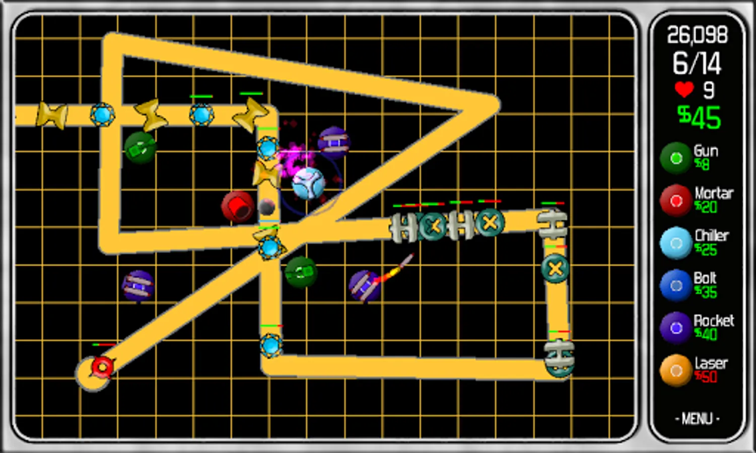 The mobs are trying to get to the end of the line to escape and it's your challenge to prevent them. You have a selection of 6 classic weapon towers to use in the defense. Spend your budget on the right towers at the right time and become the hero this world needs!