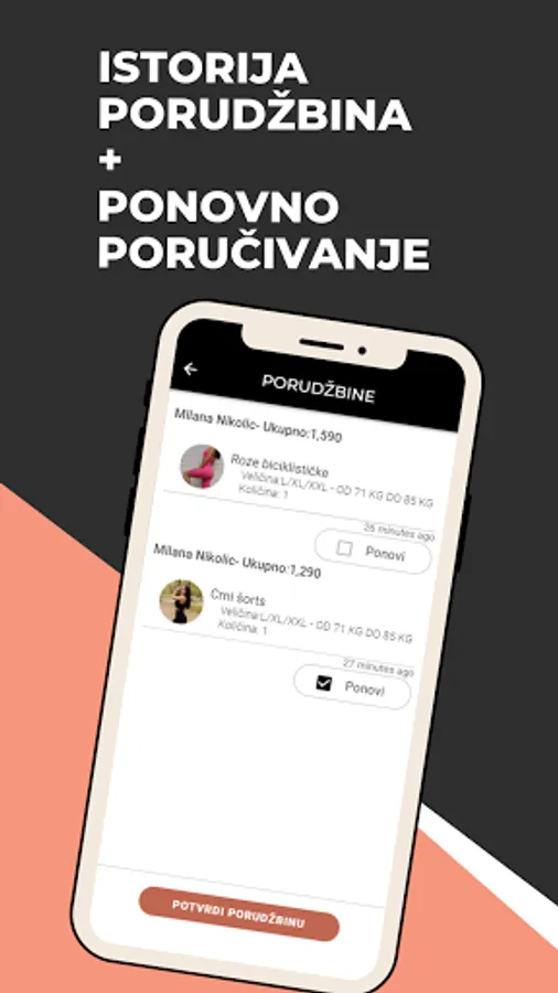 U aplikaciji je moguće pristupi odeljku u kojem se nalaze sve porudžbine koje je korisnik kreirano kako bi imao uvid, ili izvršio ponovnu kupovinu robe.