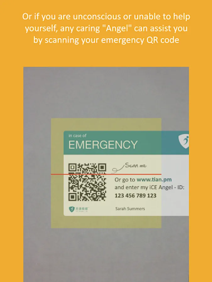 (ii) An emergency QR code displayed on your phone lock screen, or a wallet card that any Angel (rescuer) can simply scan to activate an alert on your behalf if you are unconscious or unable to trigger your own panic button. This action will automatically exchange telephone numbers between the rescue Angel and your family so that communication can be initiated by either party.