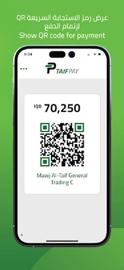 Show your customers a dynamic QR code. Taif Islamic Bank customers can make payments by scanning the code using TIB Online mobile application.