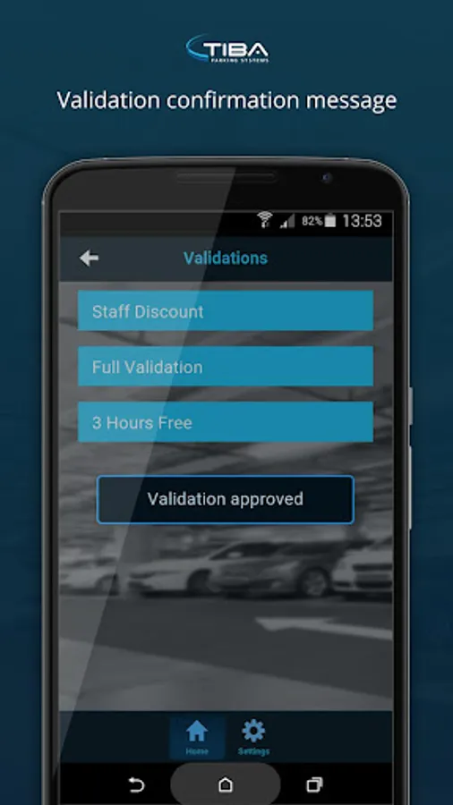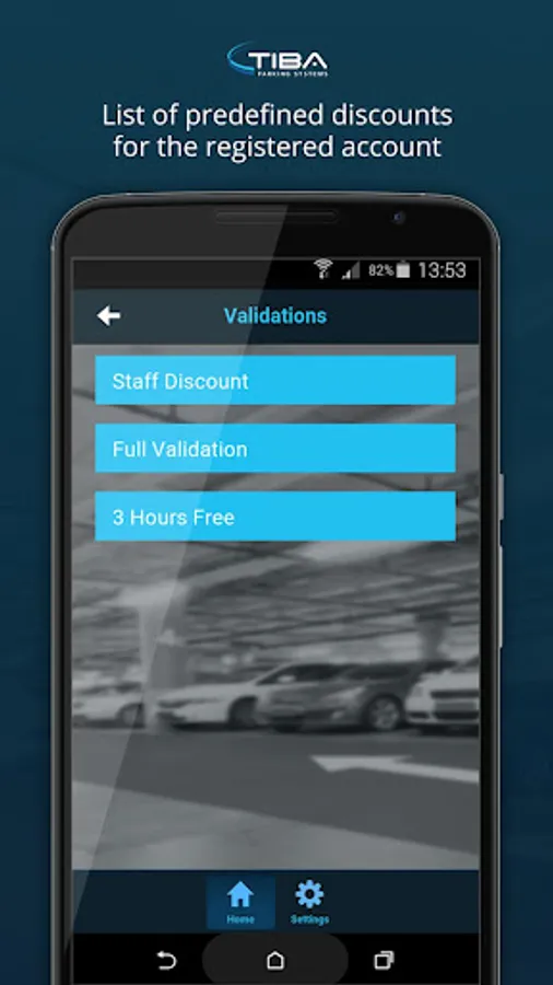 With this easy to use app simply scan the QR or bar code on the customer's ticket and choose from a list of validation options. Once the discount type is selected, the discount is applied in real time to the ticket. All TIBA PARCS devices recognize the validation, calculate the new parking fee and update the ticket balance accordingly.