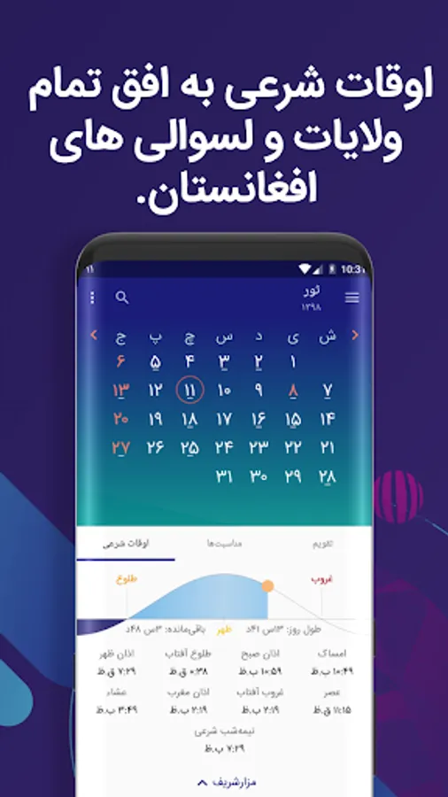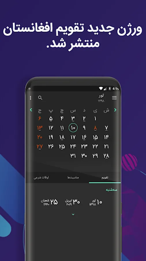 Afghan calendar is a distribution of an open source project that has been developed for Afghanistan and includes features like: date converter or date changer, compass, prayer time for different cities of Afghanistan.