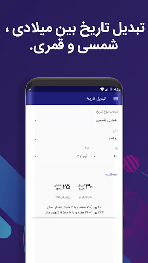 Date Converter or Date Changer: with this ability you can convert any date between Hijri Shamsi and A.D.