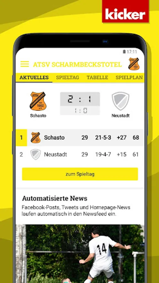 Fast access to the latest news, dates and statistics through the scrollable newsfeed with integrated Facebook, Twitter and website news!