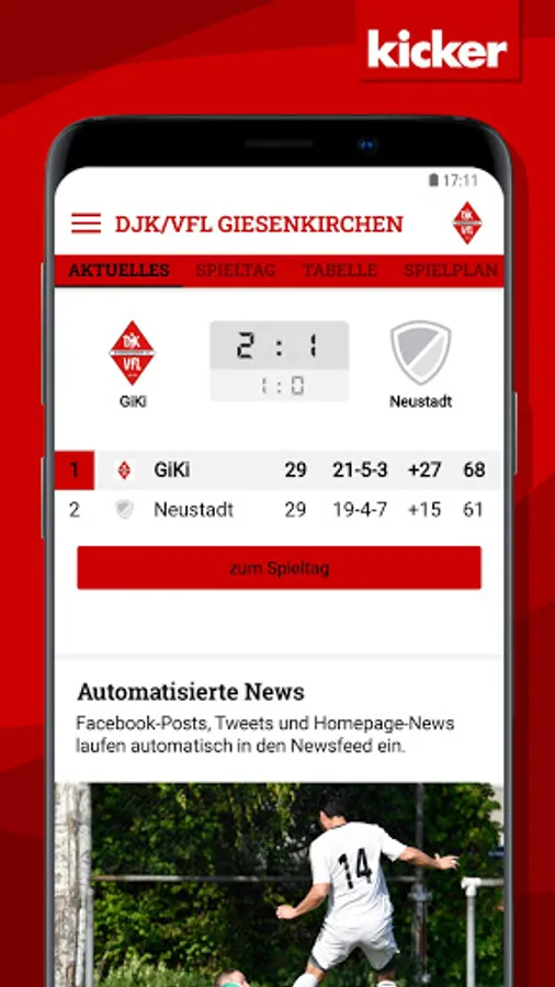 Fast access to the latest reports, dates and statistics through the scrollable news feed with integrated Facebook, Twitter and website news!