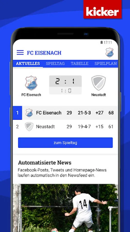 Fast access to the latest news, dates and statistics through the scrollable newsfeed with integrated Facebook, Twitter and website news!