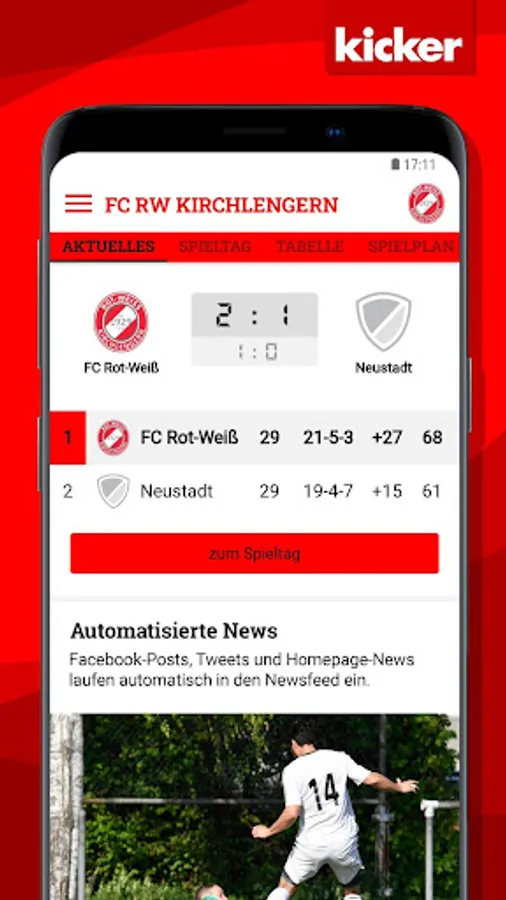 Fast access to the latest news, dates and statistics through the scrollable newsfeed with integrated Facebook, Twitter and website news!