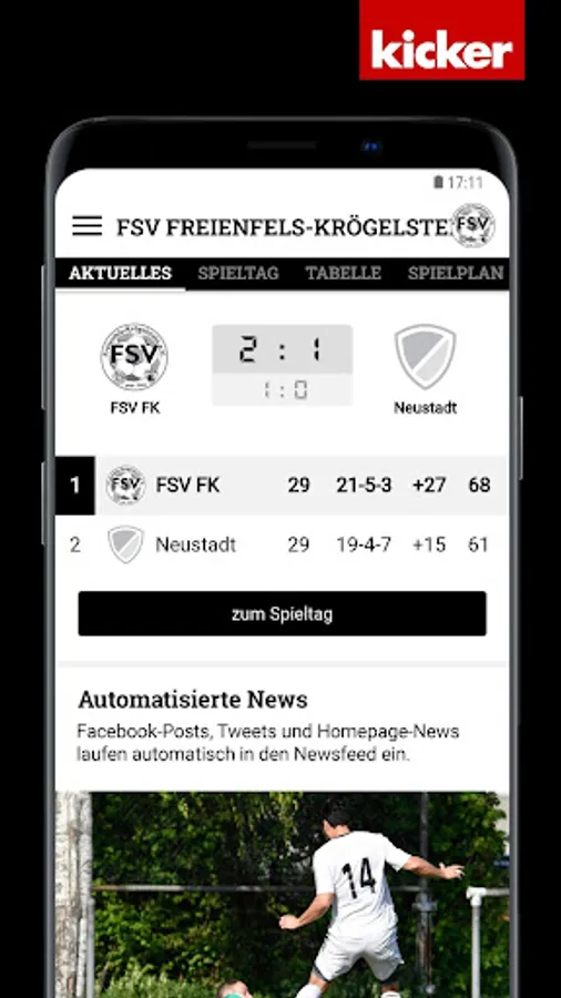 Fast access to the latest news, dates and statistics through the scrollable newsfeed with integrated Facebook, Twitter and website news!