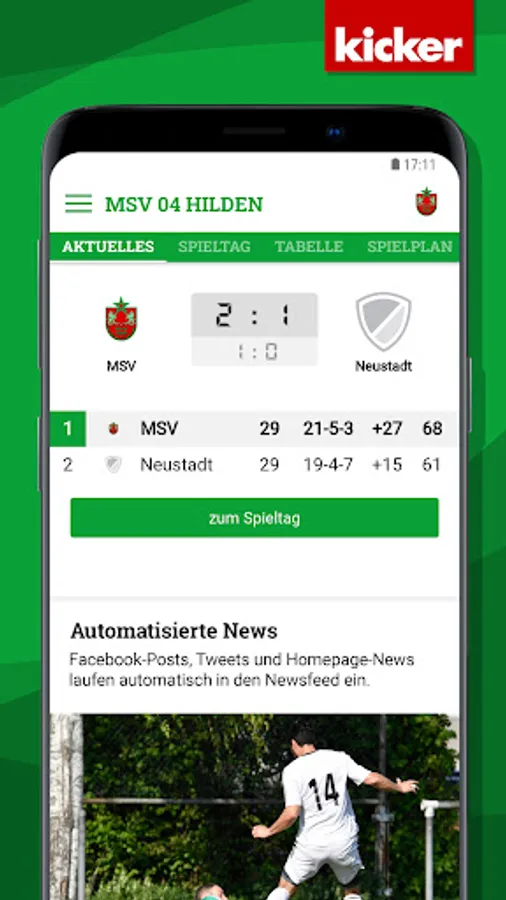 Fast access to the latest reports, dates and statistics through the scrollable newsfeed with integrated Facebook, Twitter and website news!