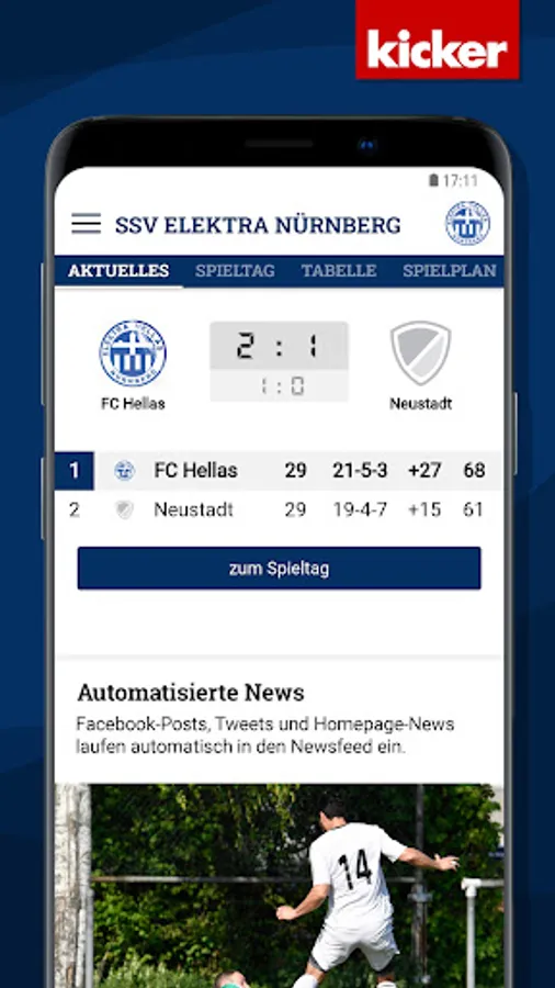 Fast access to the latest reports, dates and statistics through the scrollable news feed with integrated Facebook, Twitter and website news!