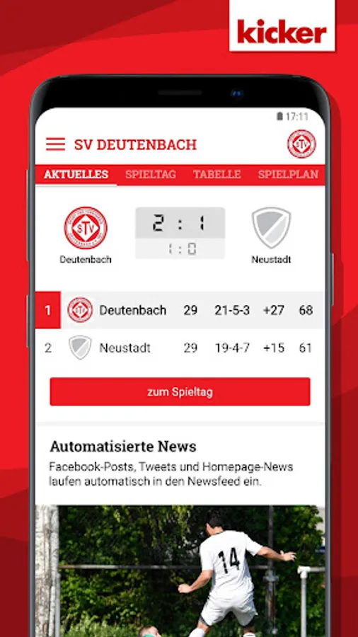 All information about our club now in the Vereinsapp of amateur football kicker. Here you get the latest news about the club, fixtures and results for all teams, statistics on the league and all information on the squad. With the integrated live ticker with push notifications you stay on the ball. And with practical features such as a text engine for creating match reports in seconds or the integration of the Facebook News of the admin can always keep the app up to date!