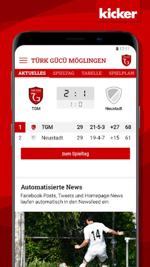 Fast access to the latest reports, dates and statistics through the scrollable news feed with integrated Facebook, Twitter and website news!