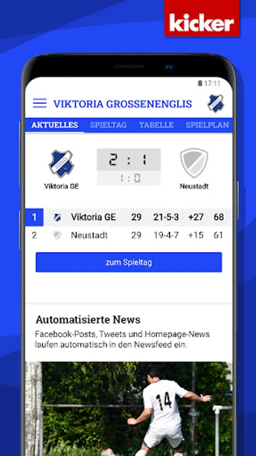 Fast access to the latest reports, dates and statistics through the scrollable news feed with integrated Facebook, Twitter and website news!