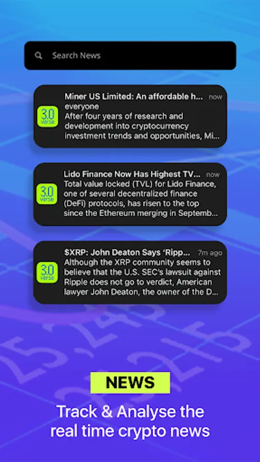 3.0 Verse focuses on making multi-market crypto trading accessible and streamlined for everyone. Our intuitively designed interface enables you to monitor lending and borrowing platforms, track DeFi coin performance, and access IC15 - the world's premier global cryptocurrency index. Receive timely alerts and utilize user-friendly tools to stay informed and ahead of the competition. Our app emphasizes simplicity, empowering you to make intelligent trading decisions and maximize your profits.