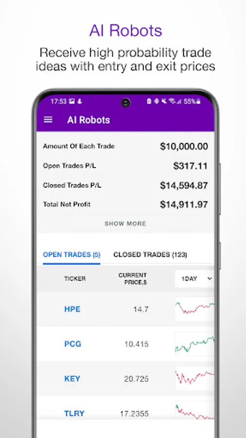 With AI Robots you can view live buy and sell trades with potential profit and stop loss.
