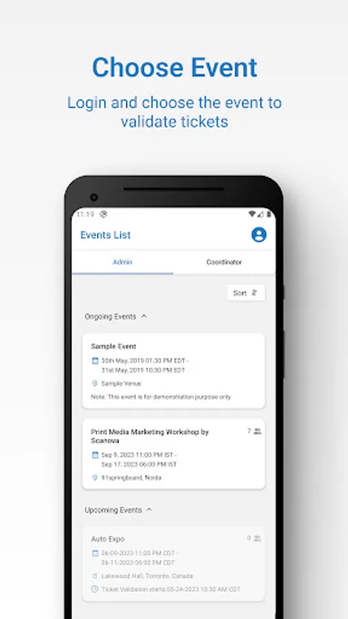 Event administrators and coordinators will have timed access to validate tickets. Using the mobile app's quick QR Code scanning feature, event guests can be authorized quickly at the point of entry. If the administrator/coordinators are unable to scan the QR Code, it is also possible to validate tickets by entering the serial codes printed on the tickets.