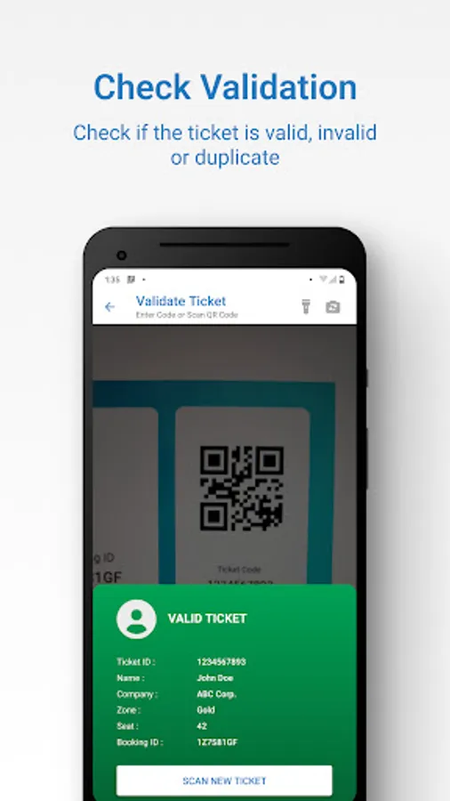 Using the Ticket Validator mobile app, event administrators and coordinators can scan the QR Code on the ticket and validate its authenticity i.e. check if the ticket is valid, invalid, or duplicate.